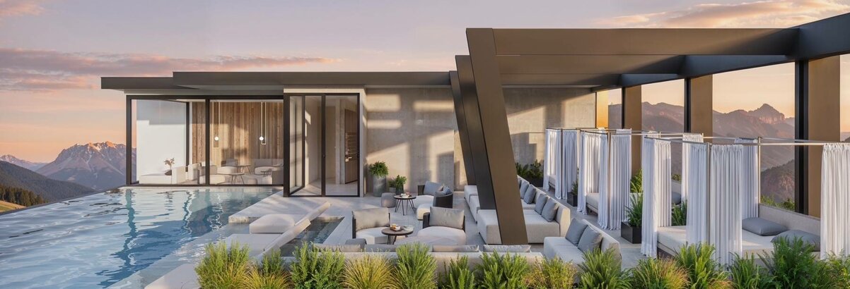 Der neue Skypool mit Terrasse eröffnet eine besondere Perspektive der Entspannung – hoch über dem Alltag. Das warme Wasser des Pools, die großzügige Sonnenterrasse und die komfortablen Liegeflächen schaffen einen exklusiven Ort der Ruhe. Ein Rückzugsort für Erwachsene, an dem Weite, Stille und Panorama zu einem einzigartigen Spa-Erlebnis verschmelzen.